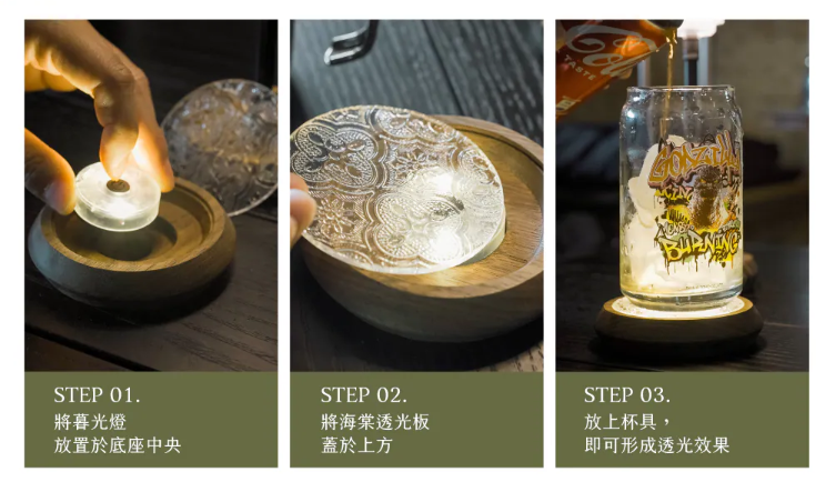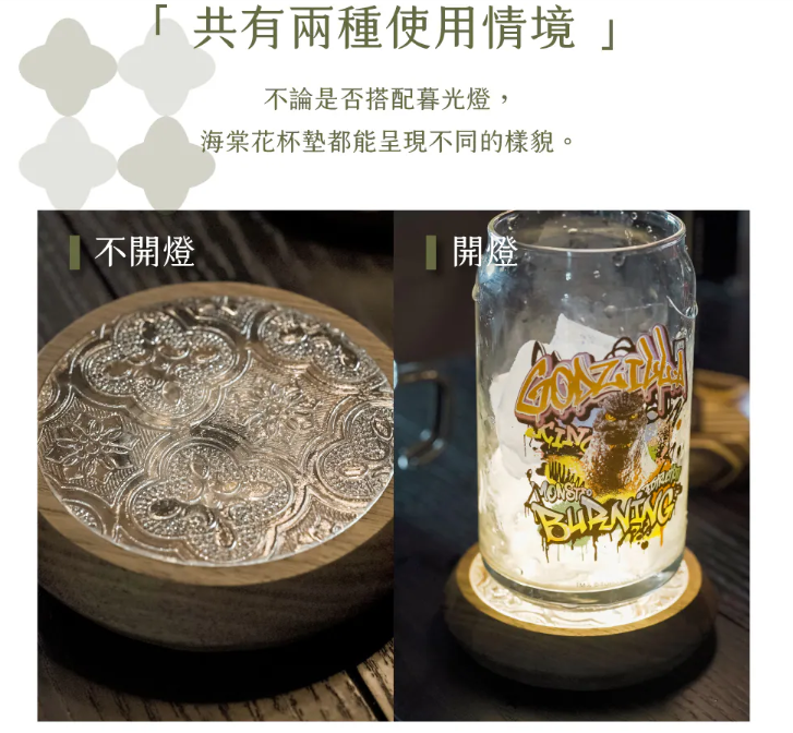 ※ 本產品為杯墊設計,需搭配暮光燈使用才能呈現透光發光效果。