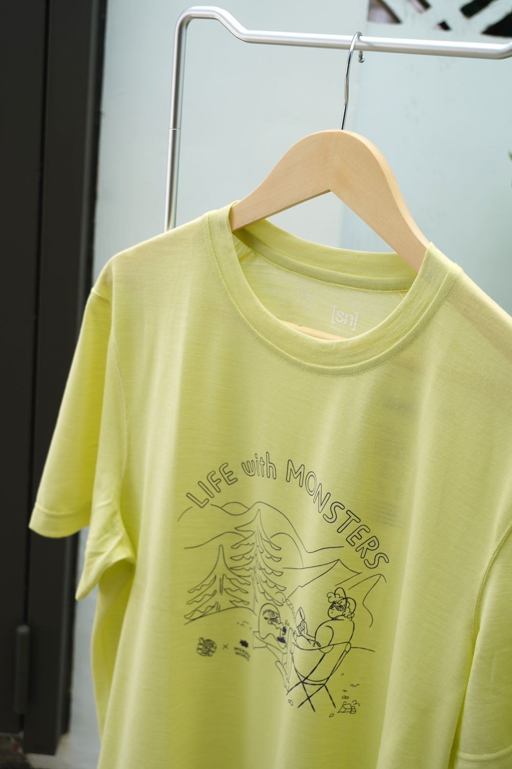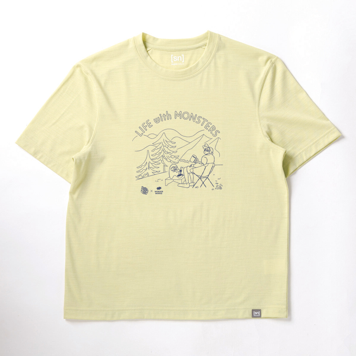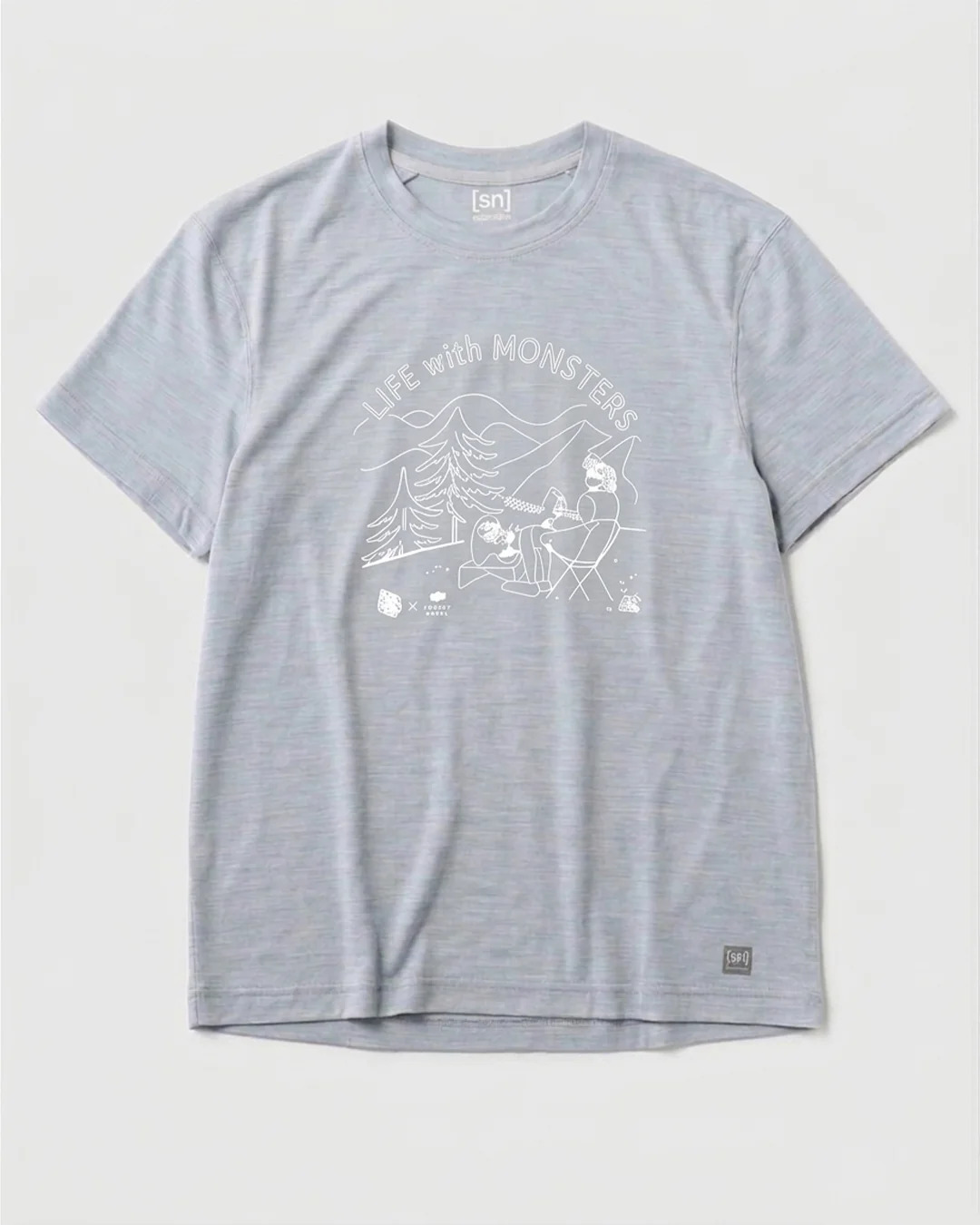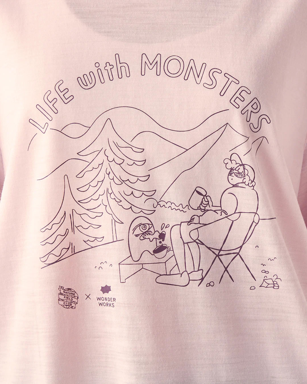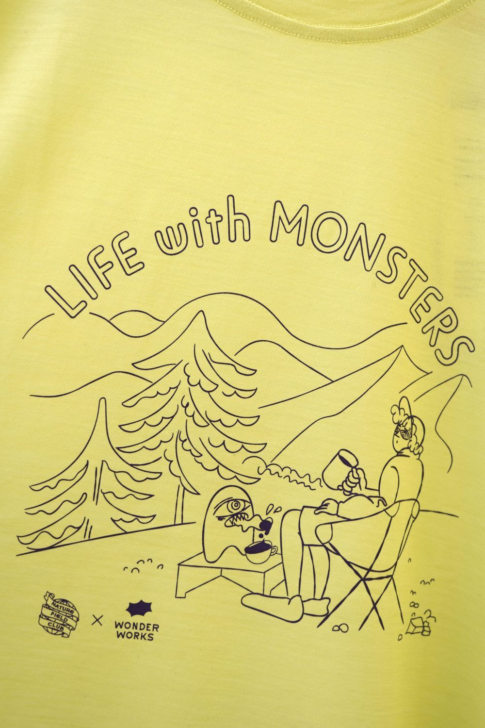 以自然大地中與怪物共度時光的幽默插畫為主題,打造出充滿童趣與放鬆氛圍的T恤。