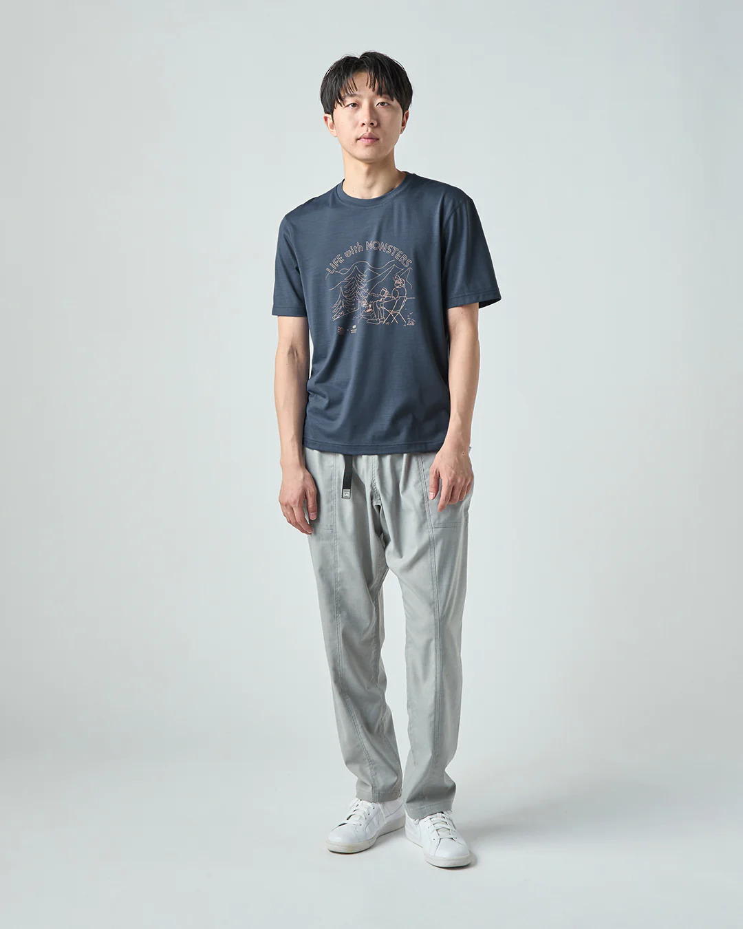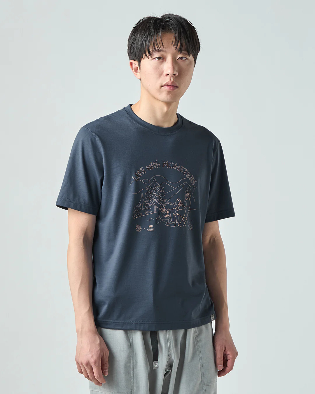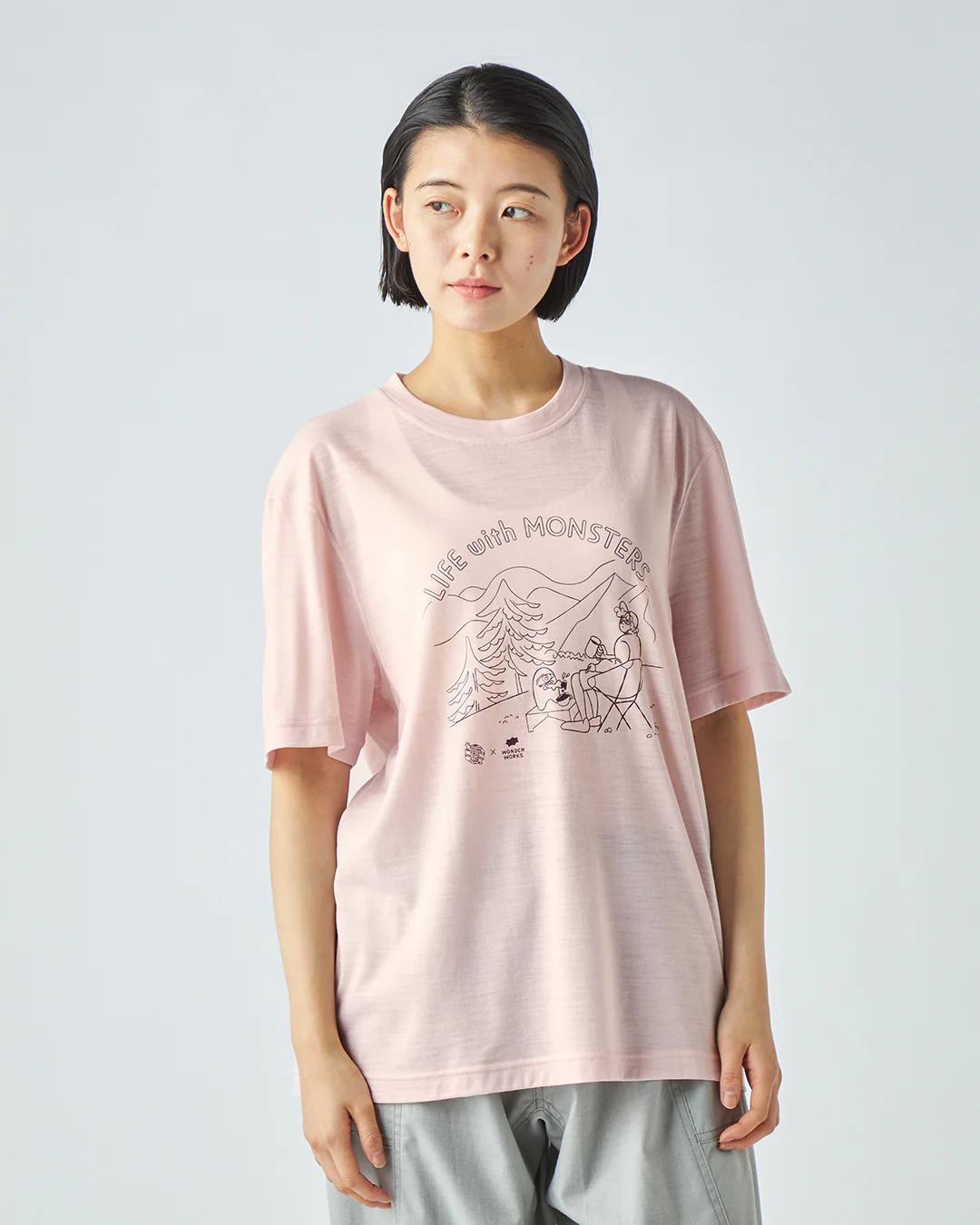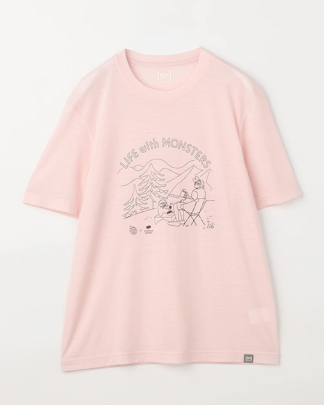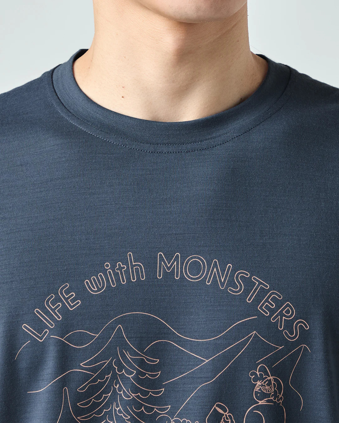 以自然大地中與怪物共度時光的幽默插畫為主題,打造出充滿童趣與放鬆氛圍的T恤。
